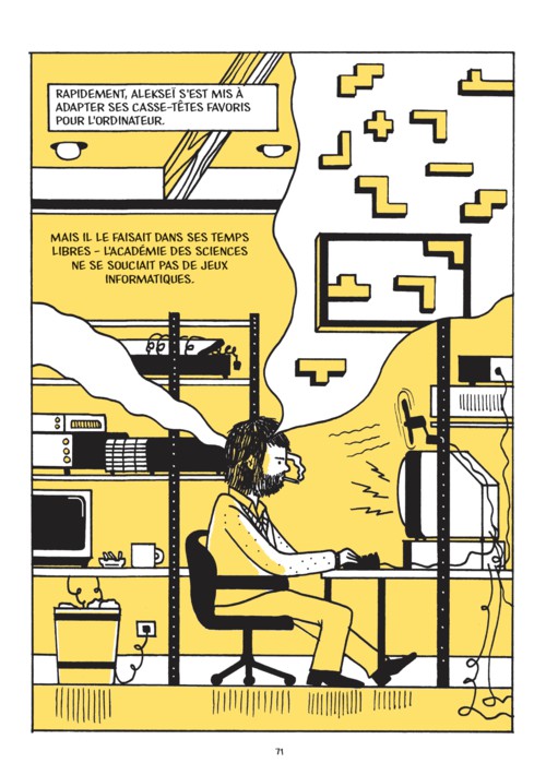 Moi, c’est avec un Game Boy que j’ai sombré dans la dépendance — oui, j’ai vu danser des blocs sous mes paupières. Il est fascinant de constater qu’un mécanisme considérablement simple, donne des résultats aussi probants : on devient accro. Bien d’autres se sont fait happer par les mâchoires du monstre numérique, conception de l’informaticien de l’académie des sciences de l’URSS, Alekseï Pajitnov. L’un d’entre eux est Box Brown, l’auteur de cette BD qui lui rend honneur, sobrement et intelligemment à l’image du puzzle qui a su captiver le monde un joystick à la fois.