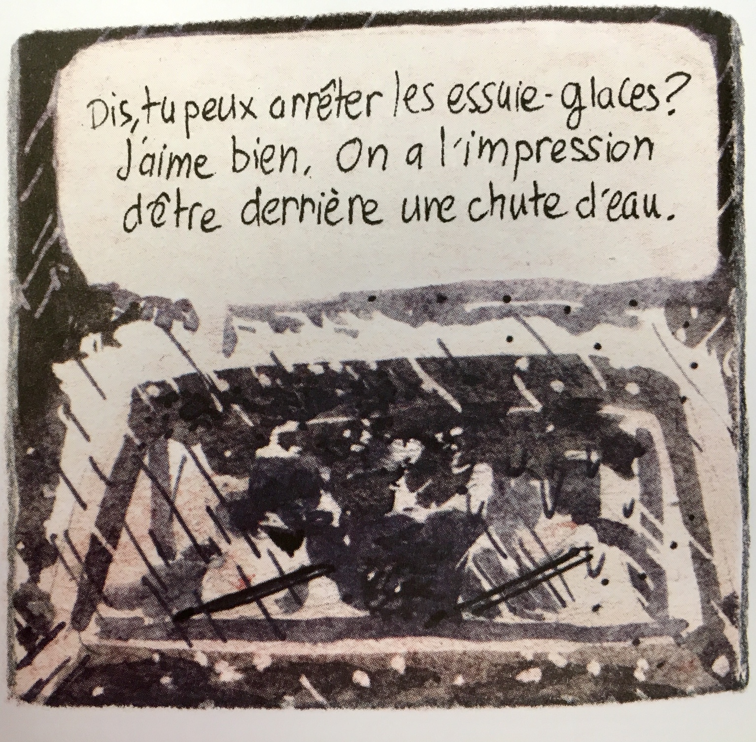 Voilà tout ce qu’il faut pour oublier ses soucis le temps d’un moment. Les chemins cahoteux, les enseignes lumineuses au beau milieu de la nuit d’encre et la rumeur de l’orage qui se prépare. Les éclairs qui sillonnent le ciel et la pluie qui martèle la tôle. La cadence des essuie-glaces, les paupières mi-closes.