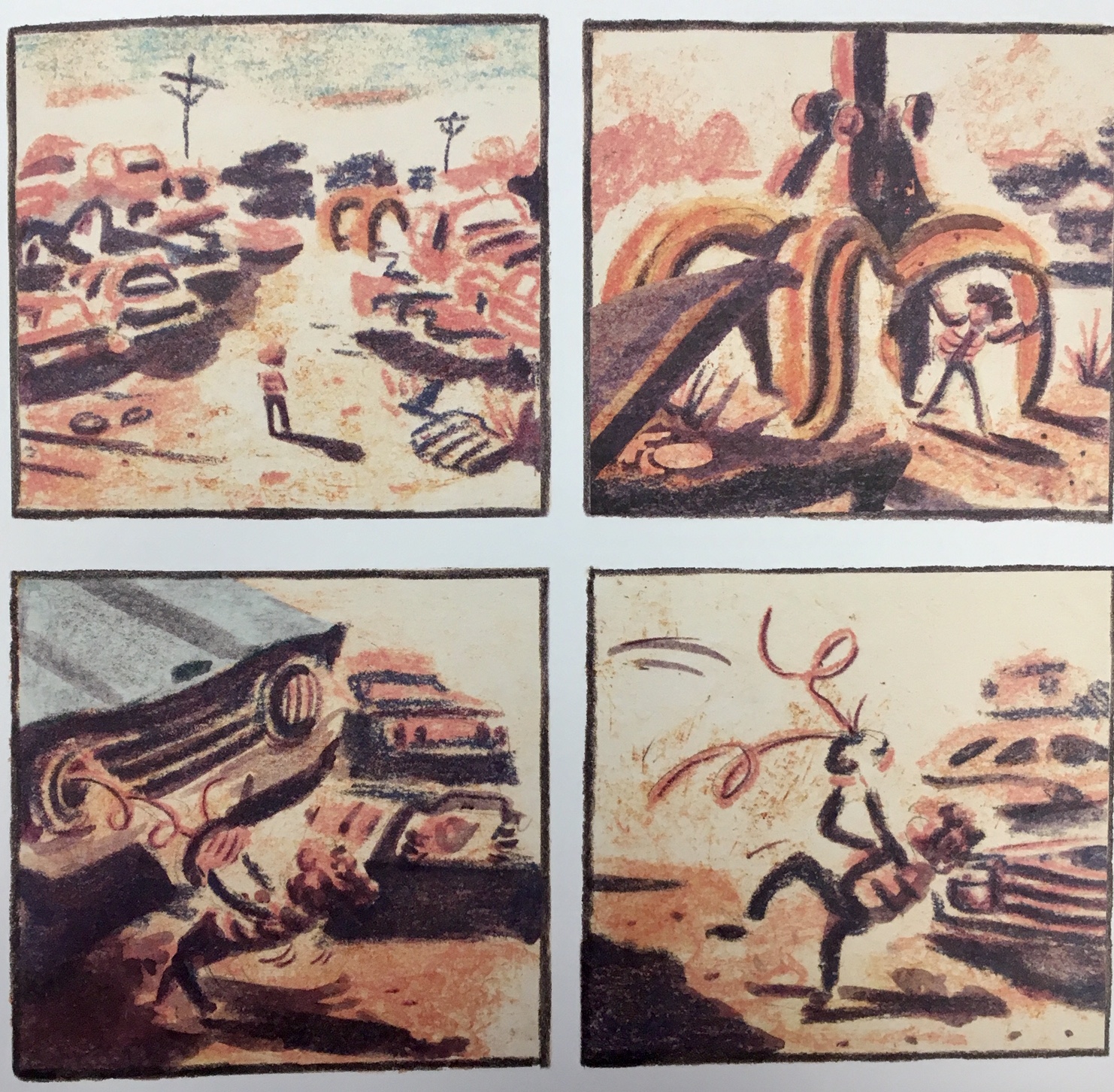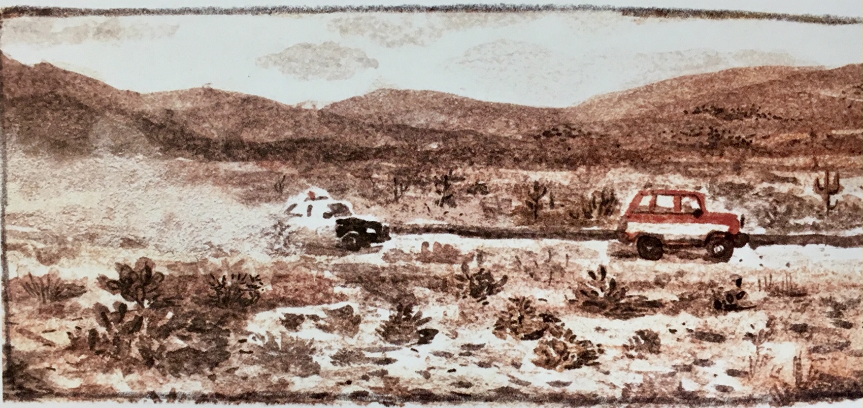 Parlant de couchers de soleil, c’est là où réside la grande force de la BD. Les illustrations au grain sablonneux et fleurant le tabac à chiquer nous donnent l’impression d’y entendre un air de steel guitar en sourdine. Chaque case ; chaque planche est une histoire en elle-même. À l’occasion, nous n’avons pas besoin de mot, mais bien d’ambiances. Et c’est dans ces silences désertiques que s’apprivoisent deux bêtes se voyant pour la première fois.