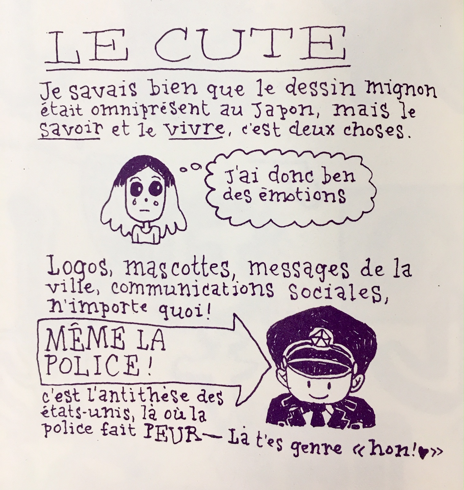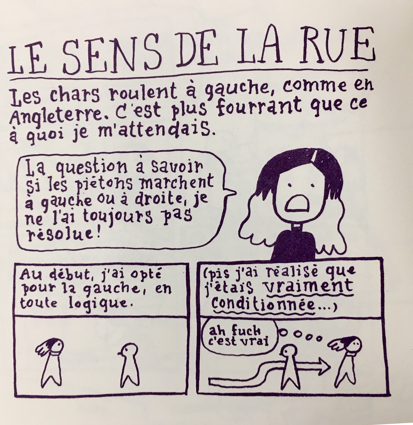 Telle une cobaye (ou Kobe?) Zviane a arpenté les rues de Kyoto pendant un mois en nous livrant ses impressions via Instagram sous forme de courtes bandes dessinées; le tout dans la pure tradition de Zviane, c’est –à-dire dans un style didactique teinté d’humour un brin absurde. Là où réside la force de l’auteure, c’est sa qualité de fine observatrice capable de traquer le moindre détail pouvant échapper aux individus lambda. On parle ici de voir le monde à travers une lentille macro pour ainsi donner accès à l’envers du décor. Qui n’a jamais eu envie de tout savoir sur les toilettes japonaises et de la minceur de leur papier?