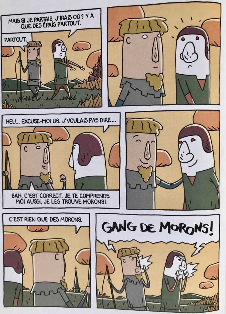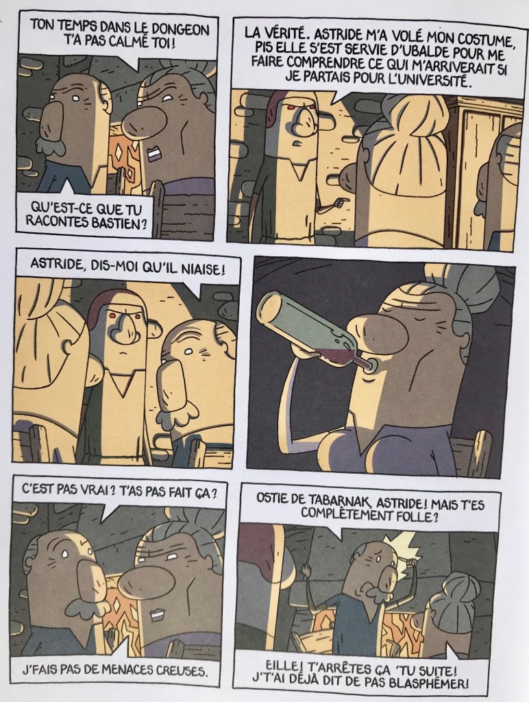 Nous sommes au Moyen-Âge, un moment de l’histoire où il ne fait pas bon étaler ses connaissances et où la mainmise du clergé peut vous ligoter au bûcher le temps de s’exclamer « hérésie ! » Bastien, le freak du village en sait quelque chose, lui qui mange des volées à répétition, incapable de fermer son clapet au moment opportun. C’est certain que reprendre constamment le monde avec condescendance vous attirera des bosses, mais il faut dire qu’il est vraiment entouré de morons, comme son ami Ubalde alias le fou et lui aiment le crier haut et fort. Avec son père et Sidonie la sorcière… euh, pardon… la sourcière, il peut au moins être lui-même sans avoir peur d’être persécuté. On ne peut pas en dire autant de son ivrogne de mère, grenouille de bénitier avide de richesse prête à les livrer à l’inquisition, viande à chien ! Si seulement il pouvait sacrer son camp à l’université au lieu de se terrer dans une grotte pour créer ses inventions. Mettez dans le lot un gars qui lui veut la peau depuis qu’il a appris que sa sœur a un crush dessus et vous avez tous les ingrédients pour une aventure dont vous êtes l’antihéros qui risque de mal se terminer.