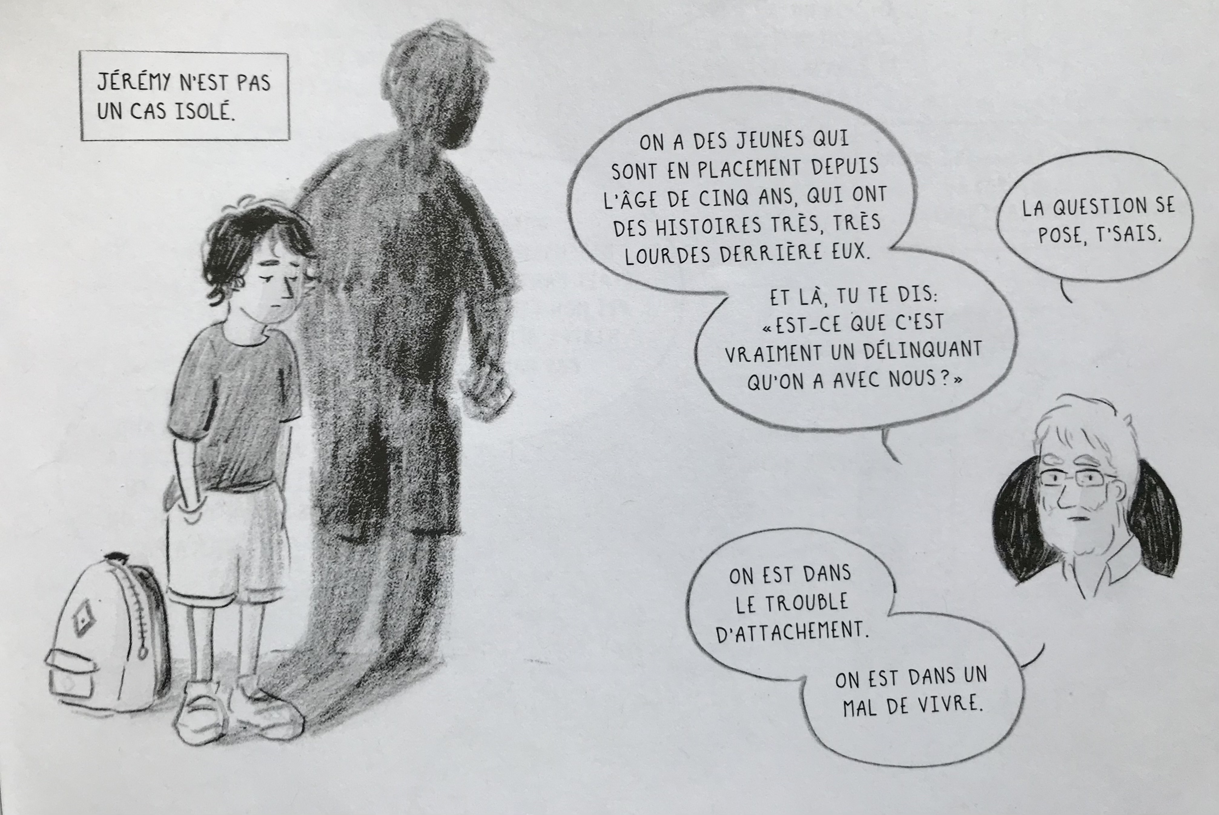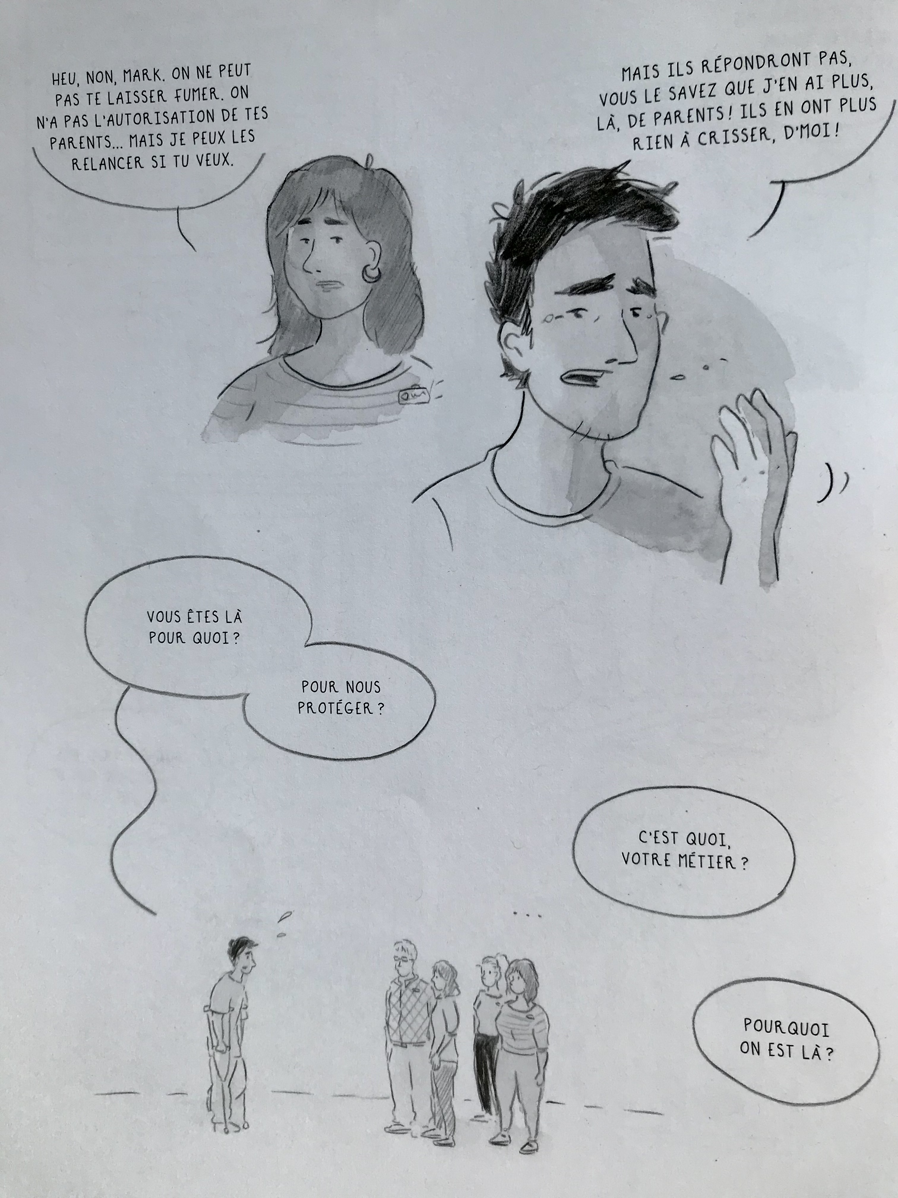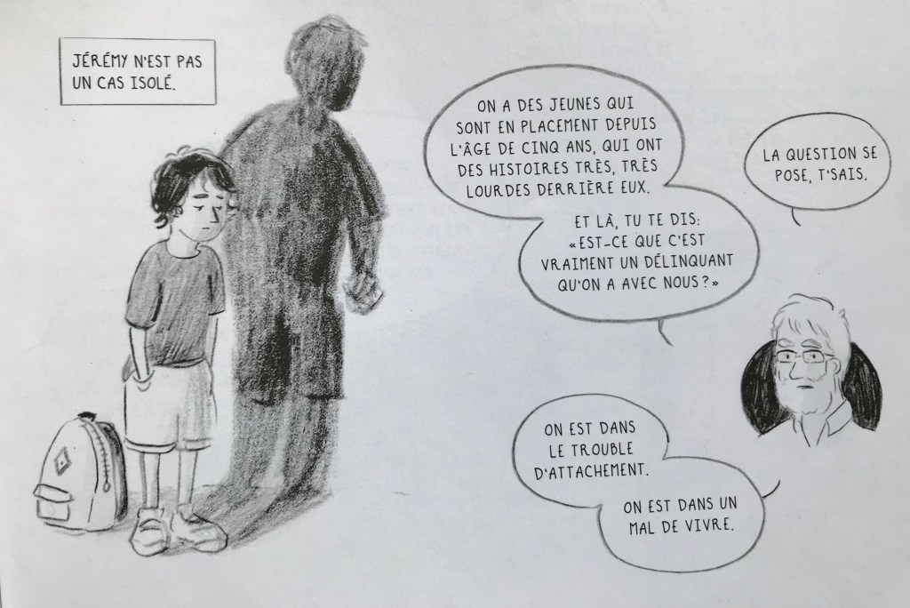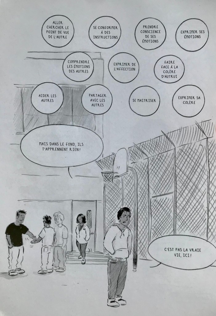 L’adage — certes — éculé voulant qu’une image vaille mille mots est particulièrement vrai dans le cas de ce bédéreportage. Il s’installe une proximité avec les sujets rendue possible grâce aux traits de Dion-Fortin. Les propos recueillis par le sociologue Nicolas Sallée nous projettent dans une réalité qui met en relief les failles d’un système où la pauvreté et le racisme subit par une frange de la société ne laissent pas grand chance de réussite. Il est tout de même réconfortant de savoir qu’à l’intérieur des murs, il y a des adultes qui n’ont pas baissé les bras et sont prêts à les attraper lorsqu’ils trébuchent.