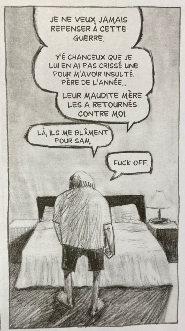 Des sautes d’humeur, les gens en expérimentent d’une fois à l’autre. Cependant, se lever à reculons, le souffle court et haletant, en comptant les jours avant le retour de voyage d’affaires de sa conjointe, Pat le vit au quotidien. Entre s’occuper des enfants, balancer sa carrière et épauler celle d’Ester, il ne reste pas beaucoup de temps pour l’introspection. Au bord du désespoir, il accuse les coups sans broncher. Il s’enterre dans le travail de recherche universitaire et tape des articles pour éviter les rapports étroits avec sa marmaille. Il les aime pourtant plus que tout au monde. C’est d’ailleurs dans cette optique qu’il agit de la sorte. Il doit protéger sa progéniture — surtout son garçon — de cette violence qui le consume. C’est en enquêtant sur la très probable racine du problème qu’il en vient à exhumer le passé militaire de son père.