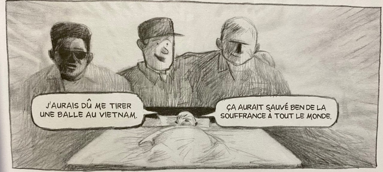 Papi alcoolique et absent, il n’y a aucun moyen de lui tirer les vers du nez. Qui peut le blâmer de vouloir oublier ? Inutile d’entrer dans les détails, mais ces gens-là y ont abandonné une partie de la raison. Revenir du Vietnam et jouer la comédie ; essayer de ne rien laisser transparaître de l’horreur et des atrocités commises. Vaquer à ses occupations : avoir une femme, un boulot, une famille… il faut le faire. Ça mérite une médaille ! Il bâillonne ses cris avec les lambeaux du tissu de la réalité et abrège ses souffrances à grandes lampées de tord-boyaux. Tout le monde trinque. Il prend aussi un cou et tout éclate en morceaux. La mère des gamins demande le divorce et part avec le bateau. Tant de ressentiment, de non-dit et de secrets affectent le jeune Pat. C’est le propre de l’épigénétique. Il doit constamment se rappeler qu’il est eux, mais il n’est pas eux. C’est ce genre de mantra combiné à de l’aide professionnelle qui viendra peut-être à bout du Minotaure qui se cache au fond des dédales labyrinthiques de son âme.