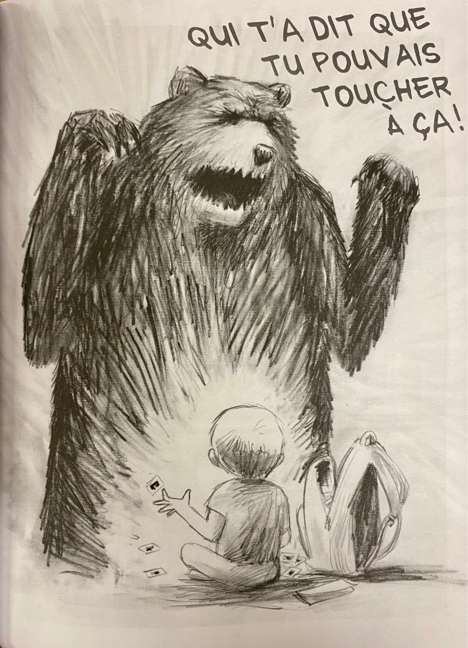 L’homme qui a vu l’homme qui a vu l’ours ; cette bête effrayée en nous qui se tapit dans l’ombre. Un grondement sourd qui nous vrille le cerveau, toujours à nous rappeler que cette rage existe et qu’elle est prête à bondir. On sent sa douleur diffuse sans mettre le doigt sur le bobo. On finit par croire qu’on est brisé pour de bon. C’est un fardeau transmis de génération en génération. Comment faire pour arrêter le cycle ? Voilà une des questions que se pose Pat à propos de la colère qui l’habite et de l’effet qu’elle a sur sa famille. Un feu roulant d’émotions encapsulé dans une œuvre qui aura pris sept ans à aboutir : Géants aux pieds d’argile d’Alain Chevarier et Mark McGuire.
