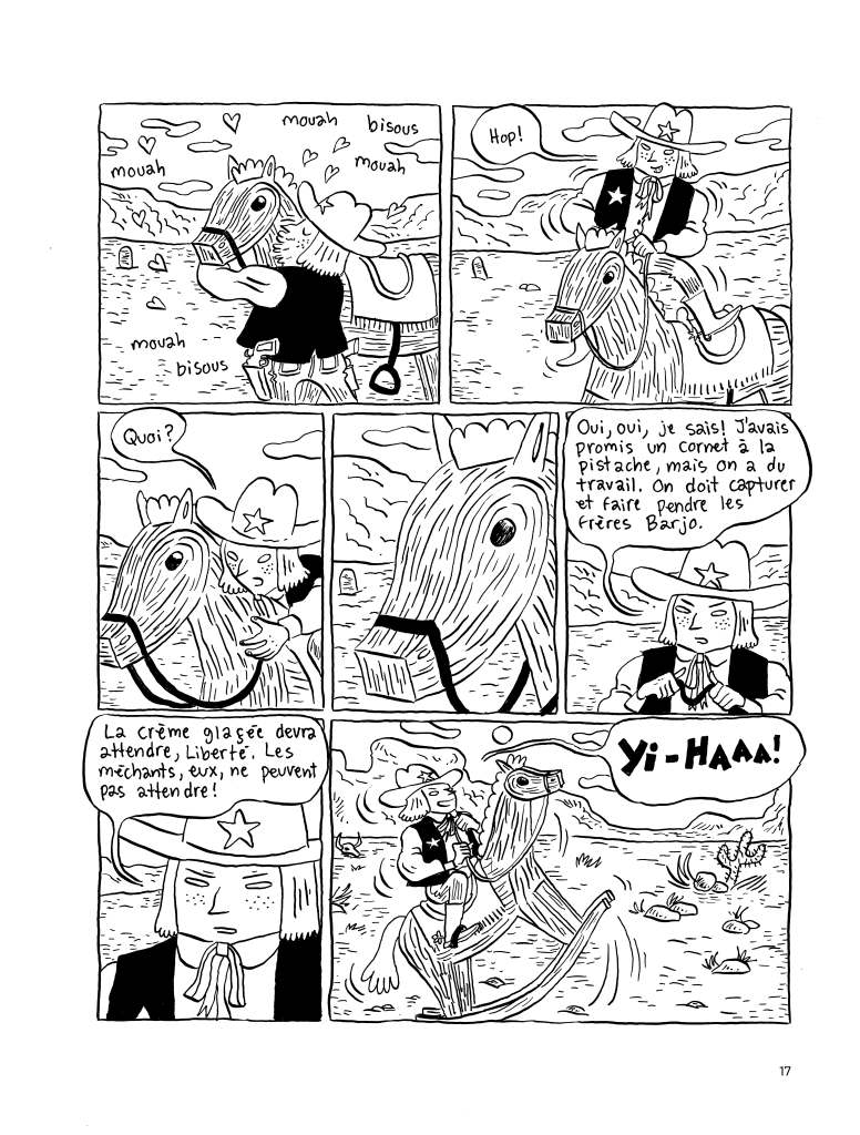 Imaginez-vous un p’tit gars d’onze ans un peu schizo avec une coupe champignon dans un suit de cowboy sur un cheval à bascule pis des squelettes pas tuables qui vendent de la poussière (snif, snif) au saloon. Kaboomie ! C’est ça Shérif junior. Un gros ramassis de wtf amalgamé dans un tout cohérent. Parce que ce n’est pas seulement un récit sans queue ni tête campé dans la ville hypothétique de Sorel-Sur-Poussière. C’est aussi un monde parallèle où on est projeté dans un set-up de caricature de vieux films westerns. Il y a de l’action, du drame et du divertissement à profusion ; un flot continu de chuckles pouvant remplir le Rio Grande. T’es un méchant taquin, Cantin ! Sérieux dude, ça va ? On peut dire que le numéro musical sur comment « l’alcool c’est super cool ! » est vraiment topos notchos.