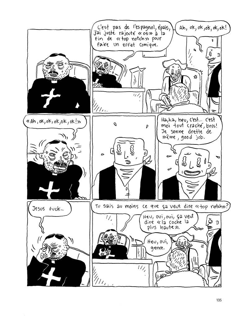 Au-delà des images, il y a les mots qui abondent. Certaines cases croulent sous les caractères. C’est là que réside la puissance de l’affaire parce qu’il est jubilatoire de lire les idioties — parfois très clever et deep — qui peuvent sortir de la tronche de ses personnages. Shout-out à Croucrou Pinson qui joue la carte à fond. Il n’y a pas juste celui-ci à porter un nom à coucher dehors. Parlez-en à Monsieur Ballefesse. On sent le potentiel de voir s’animer les scènes et les voix sont déjà toutes choisies dans nos têtes. C’est sûr que ça pognerait en bonhommes. En tout cas ça nous donnerait un break parce que des fois ça fait beaucoup de texte. Ce n’est pas nécessairement une mauvaise chose, mais il faut s’y atteler pour ne pas prendre le mors aux dents. Une fois rentré dans le groove, il est facile de se laisser happer par le récit et toute sa weirdness. C’est comme si tout devenait banal dans cet univers où l’on cueille les revolvers sur les arbres comme un fruit mûr.
