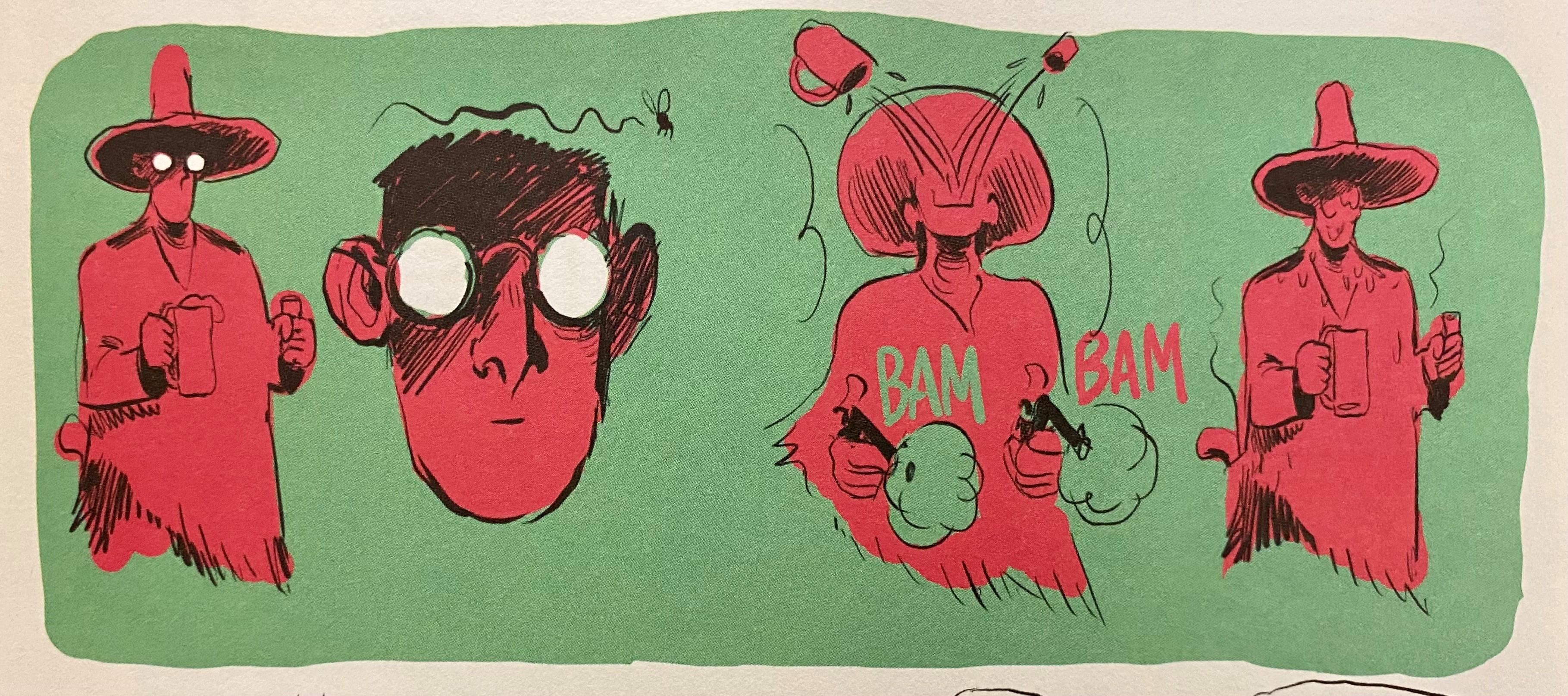 Entre en scène un chasseur de primes binoclard tirant plus vite que son ombre. À cheval sur son euh… cheval, il parcourt les grandes étendues désertiques, arides et poussiéreuses qui englobent alors l’Amérique à la recherche du pauvre bougre qui ne se doute pas déguster des pruneaux comme dernier repas. Boire, manger, trouver des renseignements, tel est le régime jusqu’à ce qu’on retrouve ce coyote barbouilleur qui va lui rapporter une tonne de fric. Sauf qu’il y a un hic, notre hors-la-loi développe une certaine appréciation de l’œuvre de ce pied-tendre. Ses convictions vacillent. Il se laisse même tirer le portrait devant le Sleeping Giant par C.M.R. ! C’est toi qui devais le lui arranger, abruti ! Il s’est emmêlé les pinceaux. Tout devient flou ; la fin de l’histoire aussi.