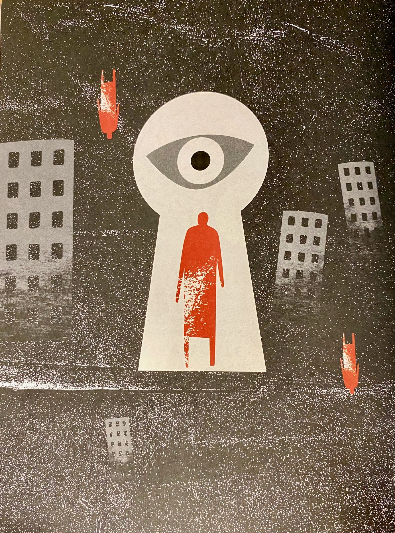 « Noir comme la guerre, rouge comme le sang et blanc comme la paix » sont les couleurs utilisées pour les illustrations. Sans équivoque tout en étant cryptiques, les images percutent et frappent l’imaginaire ; corps désincarnés à l’œil accusateur, les êtres en deux dimensions parcourent des décors hallucinés d’une violence explosive sans pouvoir s’extirper des gravats. La technique du collage et de la superposition a quelque chose du tract ou du graffiti révolutionnaire qui parsèment les murs toujours debout des villes assaillies. Difficile de trouver une iconographie plus forte et représentative. Le spectre de l’ancien régime soviétique est omniprésent comme les retombées radioactives de Tchernobyl. Il faut l’abstraction pour se soustraire à ce monde et en rêver d’un autre, meilleur.