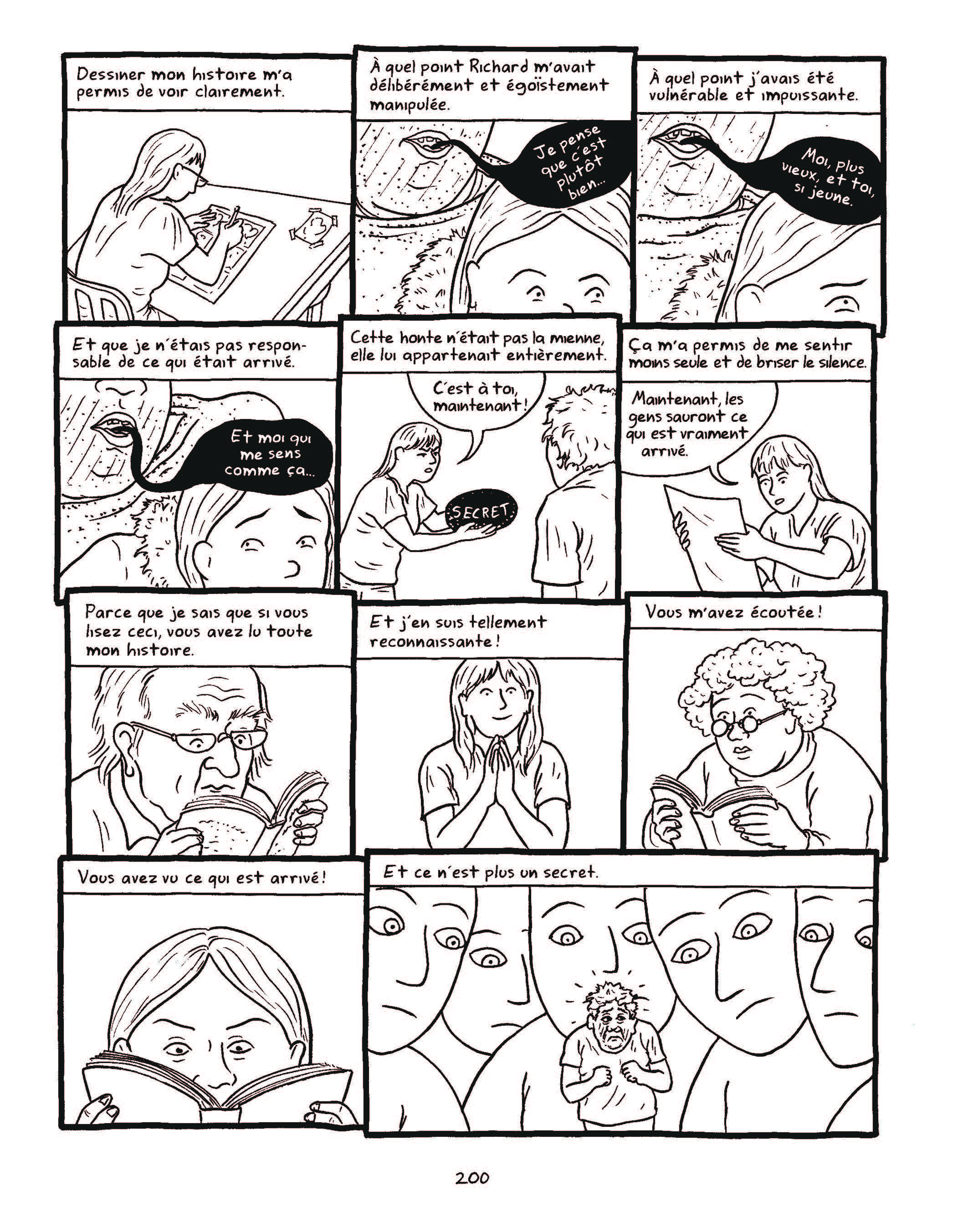 Il fallut qu’elle le recroise des décennies plus tard pour que surgissent les souvenirs refoulés et la douloureuse réalisation que les agissements de cet individu retors ont dicté sa vie et ses relations en plus de la faire crouler sous le poids de ce lourd passé hanté par la honte. À défaut de foutre un coup de pied dans les couilles du vieillard, elle décide de le traduire devant la justice afin que tout le sache. Un bien piètre baume qui jamais ne guérira complètement les blessures infligées. Beaucoup d’argent et de temps ont été engloutis pour resserrer les mailles du filet par lequel il a fini par s’échapper. Il ne reste plus qu’à se reconstruire et tourner la page.