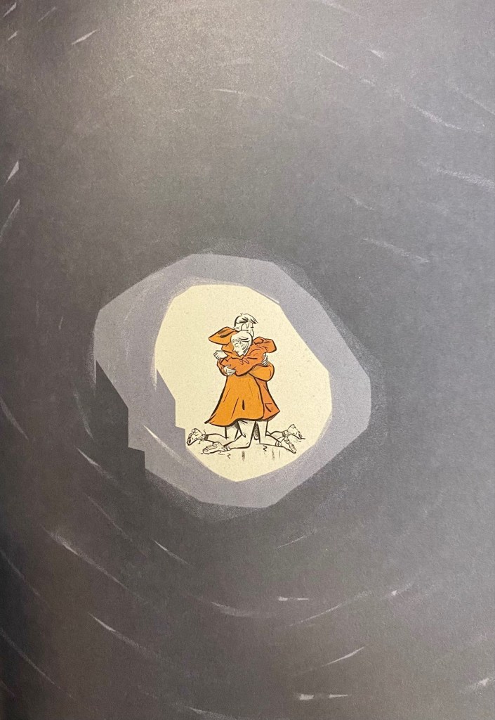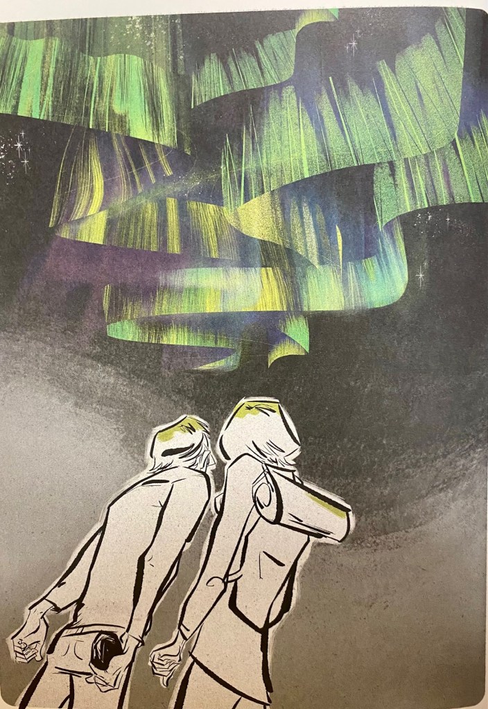 On sort sonné de la lecture de cette œuvre dont la douce amertume nous laisse avec un pincement au cœur et une boule dans la gorge. Les mots de Nicola-Frank Vachon qui nous éclaboussent sont salins et vivifiants comme l’embrun. Quant à eux, les dessins de Paul Bordeleau sont lumineux et colorés à l’instar des aurores boréales — on dirait des cartes postales vintage. La meilleure association depuis le hákarl et le brennivín !