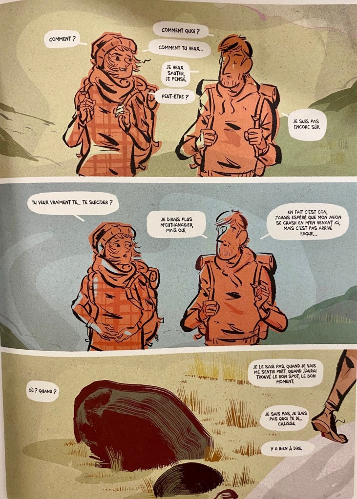 La trentaine bien installée — la maladie aussi — notre aventurier du trépas part le backpack lourd et le cœur léger. Peu importe ce qui pourra arriver, nous ne sommes tout de même juste qu’un tas d’atomes, des pixels ; on évolue dans un genre de simulation pas claire qui nous sera dévoilée une fois notre révérence tirée. Pas de grandes effusions ni de petits bonheurs pour le condamné qui s’est volatilisé comme le fantôme qu’il a toujours été afin de se soustraire au regard des autres. C’est vraiment plate que le plan qu’il avait échafaudé allait foirer ben raide à bord d’un autobus bondé de touriste, ya ? Des failles sismiques commencent à faire monter la pression d’un geyser métaphorique dont il risque de jaillir des émotions tapies sous la surface. Aura-t-il le courage d’attenter à ses jours tandis qu’il a encore le contrôle de son corps en décrépitude ?