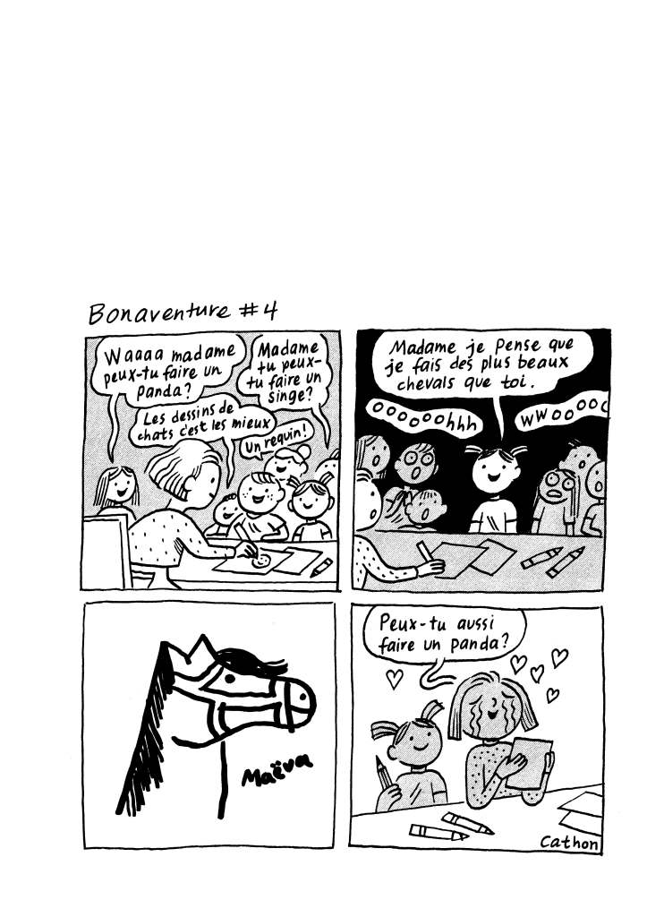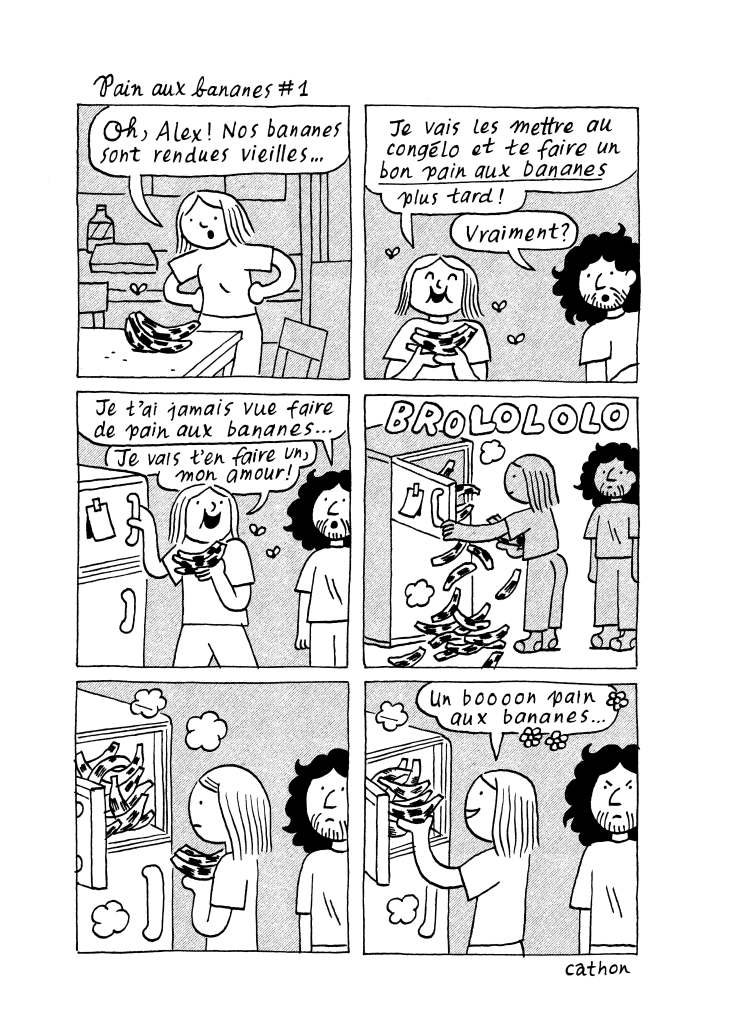 C’est spontané, parfois calculé, souvent délicieux, rarement indigeste : la vie, c’est comme une salade de fruits. D’autres vous diraient que c’est plutôt comme une boîte de chocolats, mais ces gens-là sont probablement en carence de vitamines et divaguent. Quoiqu’au prix exorbitant des produits frais aussi bien manger des bananes en guimauve. En tout cas, Catherine Lamontagne-Drolet aka Cathon avait de la suite dans les idées quand elle a décidé de donner à son recueil de strips autobiographique le nom de cette succulente et colorée préparation culinaire. Prêts pour une grosse cuillerée de moments magiques ?