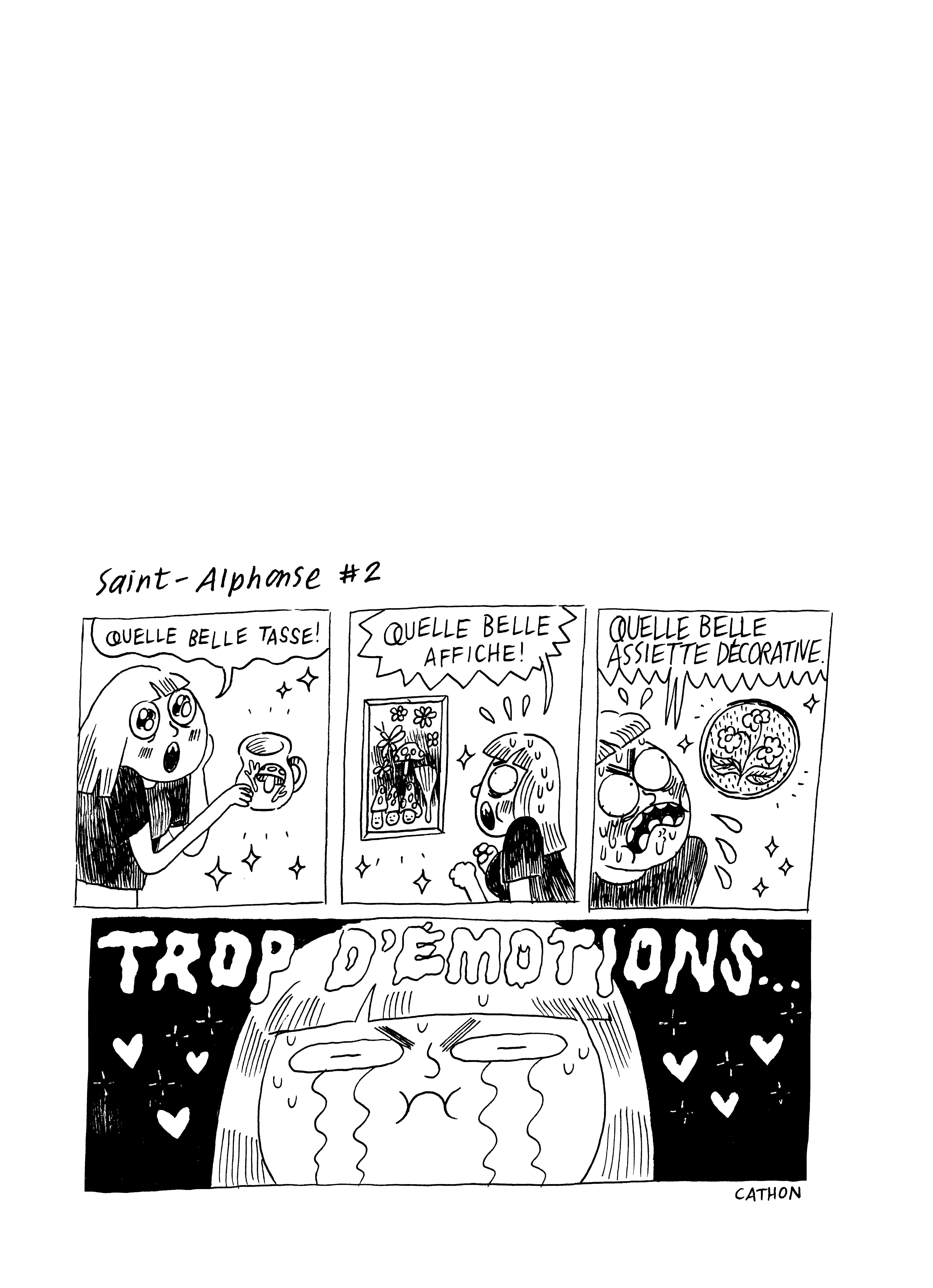 C’est spontané, parfois calculé, souvent délicieux, rarement indigeste : la vie, c’est comme une salade de fruits. D’autres vous diraient que c’est plutôt comme une boîte de chocolats, mais ces gens-là sont probablement en carence de vitamines et divaguent. Quoiqu’au prix exorbitant des produits frais aussi bien manger des bananes en guimauve. En tout cas, Catherine Lamontagne-Drolet aka Cathon avait de la suite dans les idées quand elle a décidé de donner à son recueil de strips autobiographique le nom de cette succulente et colorée préparation culinaire. Prêts pour une grosse cuillerée de moments magiques ?