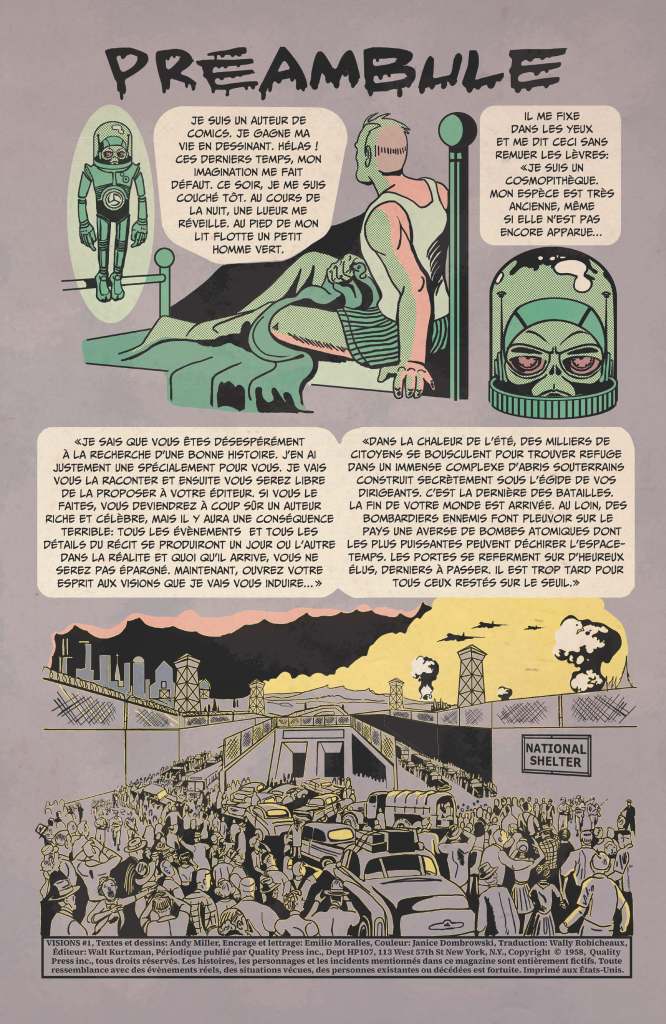 Délire vespéral ou manifestation surnaturelle, peu importe son origine, l’irruption d’un être provenant des étoiles dans la chambre à coucher de cet auteur de comics n’était pas fortuite. Son message télépathique était sans équivoque : octroyer gloire et fortune en échange de la fin du monde. Qui pourrait résister à une telle offre. L’écrivain fantôme — ou extra-terrestre, c’est selon — allait lui dicter les meilleures histoires qui mèneront à l’extinction éventuelle de la race humaine et à l’avènement des cosmopithèques. Le pacte scellé, l’oiseau de malheur débite ses prédictions aux répercussions dévastatrices. Les lecteurs n’ont aucune idée que le récit dont ils sont friands illustre planche par planche des événements lointains que même le plus illuminé des devins ne pourrait concevoir. Le pire dans tout ça, c’est que rien ne peut éviter cette inéluctable marche vers la mort ; c’est écrit dans la pierre et coulé dans le béton. Espérons que le bédéiste aura eu le temps de profiter de sa fortune avant qu’elle ne s’envole en fumée et qu’il ne soit six pieds sous terre avec le reste des pauvres bougres n’ayant pas pu se mettre à l’abri du cataclysme nucléaire.