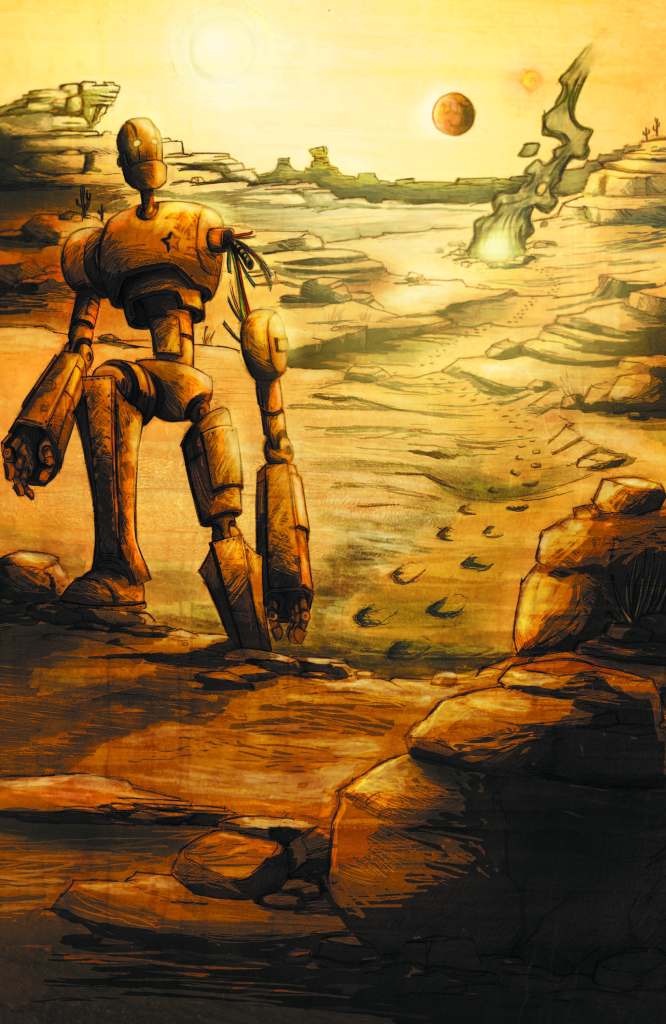 Des déchets… des tonnes et des tonnes. Ils proviennent de conteneurs détournés de leur trajectoire pour aller s’écraser sur la planète tellurique MR.709.74650, aussi surnommé Far Out par les locaux : des cowbots ou plus simplement des robots qui se prennent pour des cowboys. Les conditions arides sur ce caillou flottant dans le vide intersidéral s’y prêtent à merveille. On est bien dans le futur, non ? Alors, pourquoi ces automates agissent-ils comme s’ils vivaient à une époque antédiluvienne ? Leurs circuits ont probablement grillé à l’impact du sol ocre puisque cela ne faisait pas partie du protocole. La course à l’armement les a rendus désuets. On leur a trouvé une autre utilité : préparer le terrain pour une colonie qui ne viendra pas. Un malfonctionnement plus tard et on les retrouve dans un western à jouer au poker. Des bribes d’informations parasitées s’échappent de leur mémoire morte pour les rappeler à l’ordre, mais celles-ci sont floues comme un mirage en plein désert. Sous un soleil de plomb, les jours s’égrènent sans trop d’incidents jusqu’à ce que tombe du ciel un nouveau-né tout d’acier trempé rompant l’équilibre. Pas tout à fait amnésique, il cherche son étoile pour atteindre la paix d’esprit et un sens à son existence.