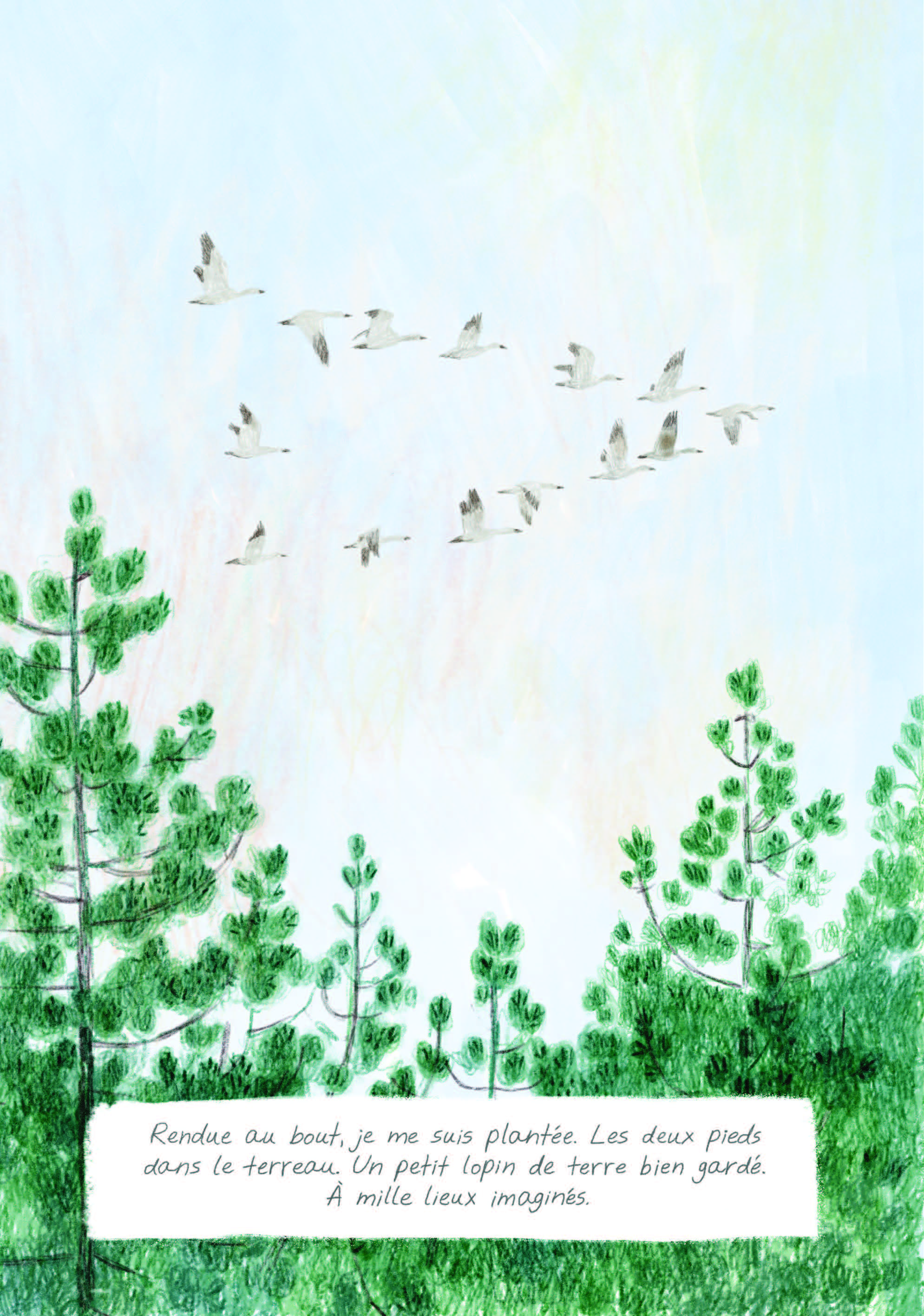 Cet appel de la terre omniprésent dans la conscience collective s’est immiscé dans cette œuvre d’autofiction qui embaume la résine et la citronnelle. Ça fleur aussi l’amour qu’Amélie Dubois porte à son sujet. Des ambiances feutrées aux décors estompés nous poussent vers une douce rêverie d’un monde plus simple dicté par le rythme des saisons. C’est également une ode à la résilience ou comment faire de la limonade pas trop surette avec ce que la vie nous envoie. Difficile de ne pas se sentir interpellé, suivre son exemple et saisir la clé nous libérant du bureau auquel nous sommes métaphoriquement enchaîné.