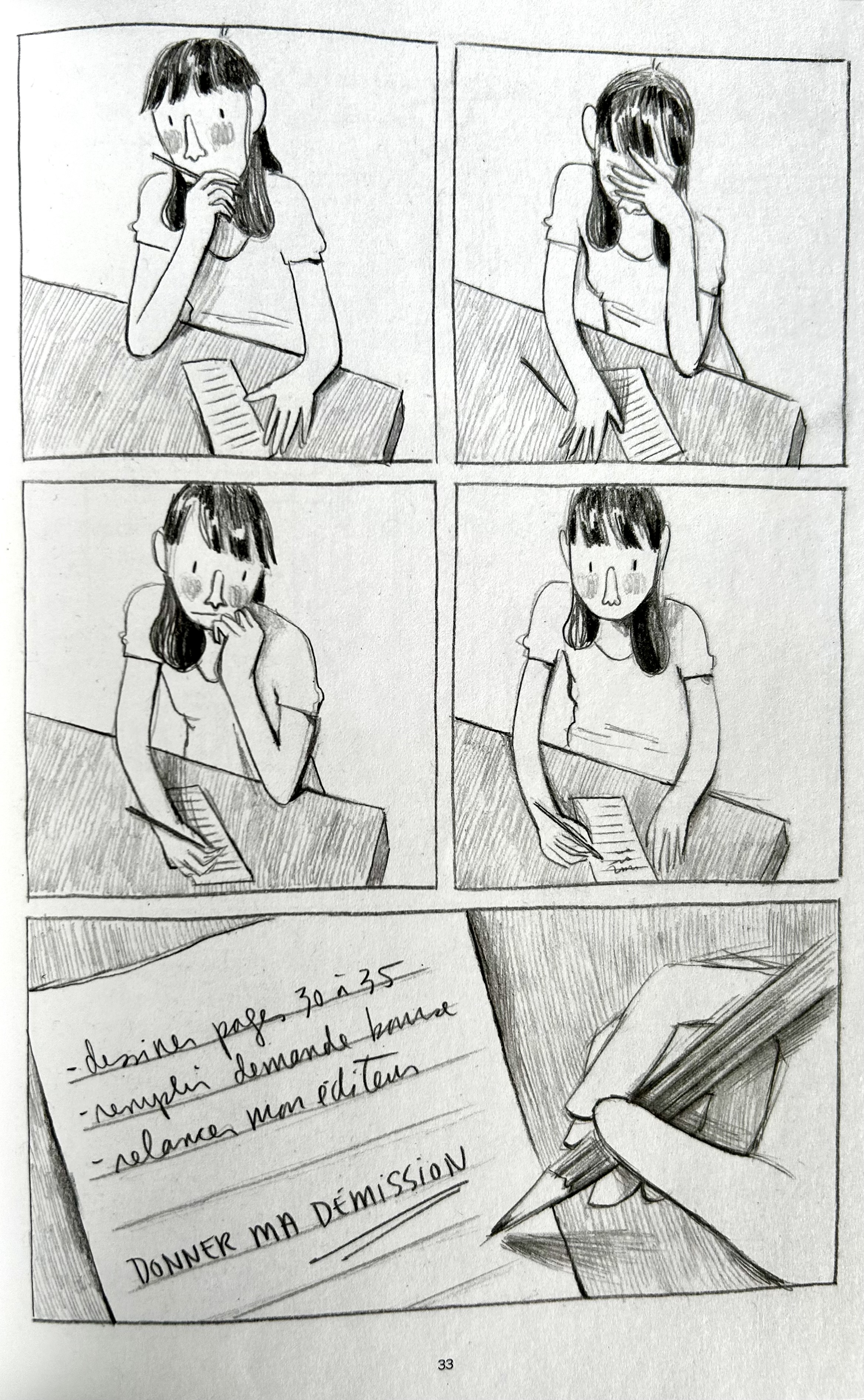 La — encore — jeune femme a plus d’une corde à son arc ; elle fait de la BD en plus de concevoir des signets commémoratifs. On entend déjà les langues sales dirent qu’elle est de folle de se lancer à son compte dans un domaine qui rapporte des peanuts, mais on ne peut empêcher un cœur d’aimer. La voilà donc à concentrer toutes ses énergies à la réalisation de sa première œuvre. C’est mieux d’être un hit parce que sinon ça va mal aller à la shop. Heureusement que son chum est là pour la rassurer — lui et Andre Agassi ?