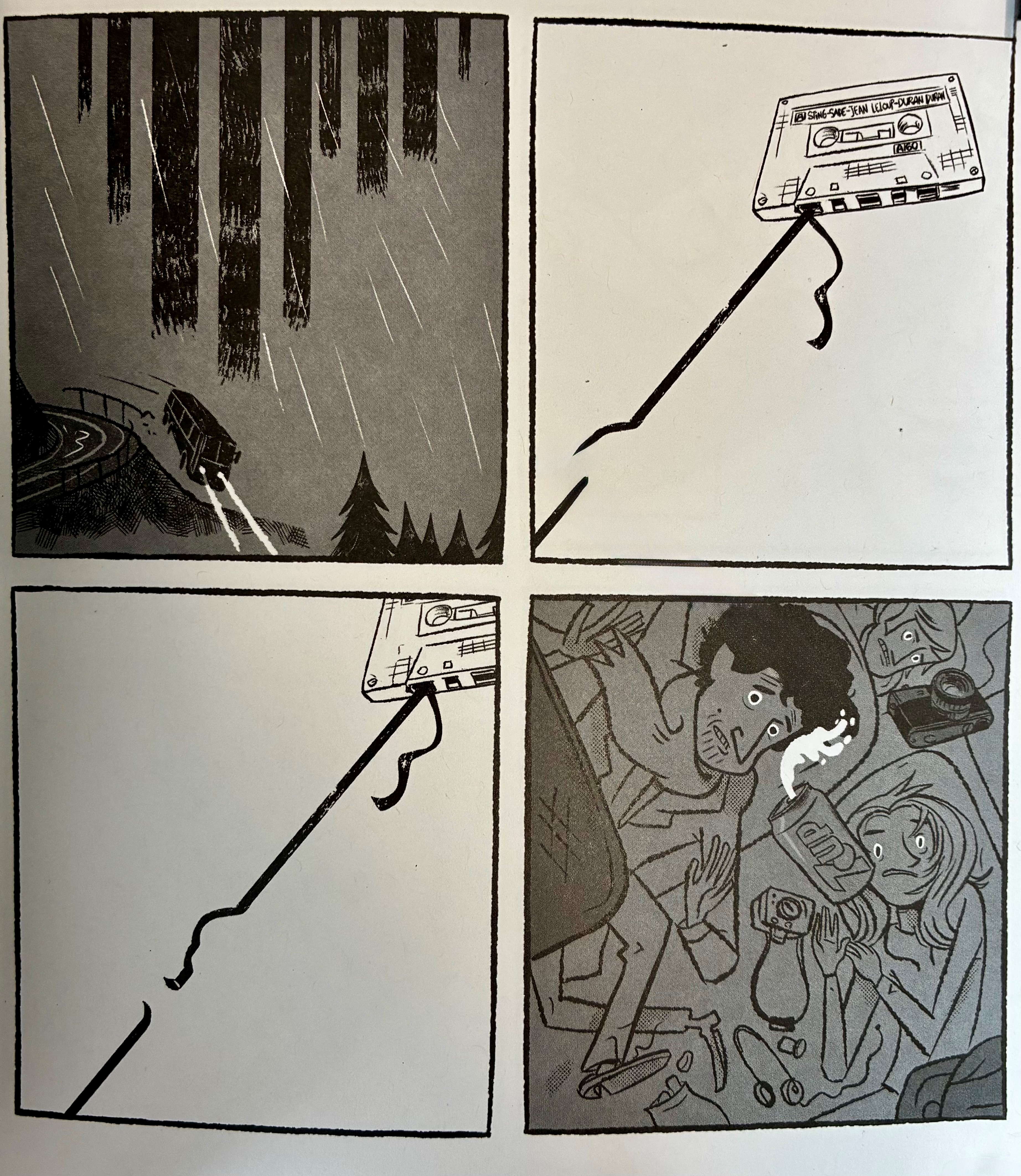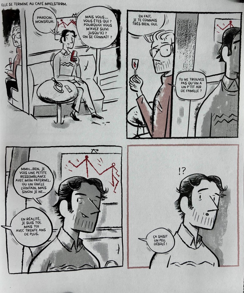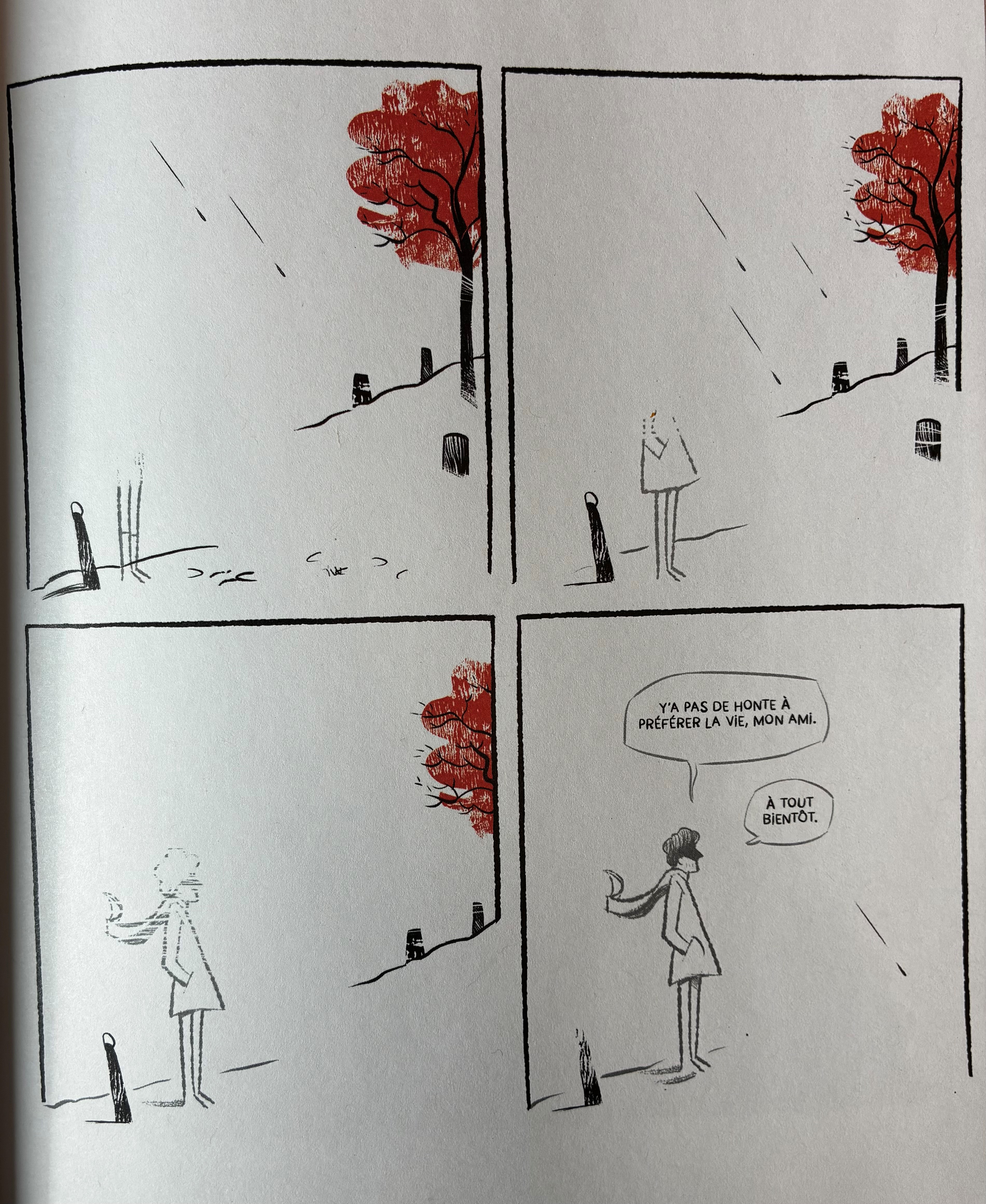 Une ode à l’amitié et la vie en général. Cinématographique à souhait avec un brin d’humour, lorsque senti. On touche à l’universel, le réconfort doux-amer d’une période pas si lointaine néanmoins révolue. Paul Bordeleau se rabiboche avec son style de l’époque. Tout en hachure, se permettant d’en beurrer épais, nous montrant ainsi l’étendue de sa palette. Une astucieuse mise en abyme testée et éprouvée est utilisée pour cimenter le tout.