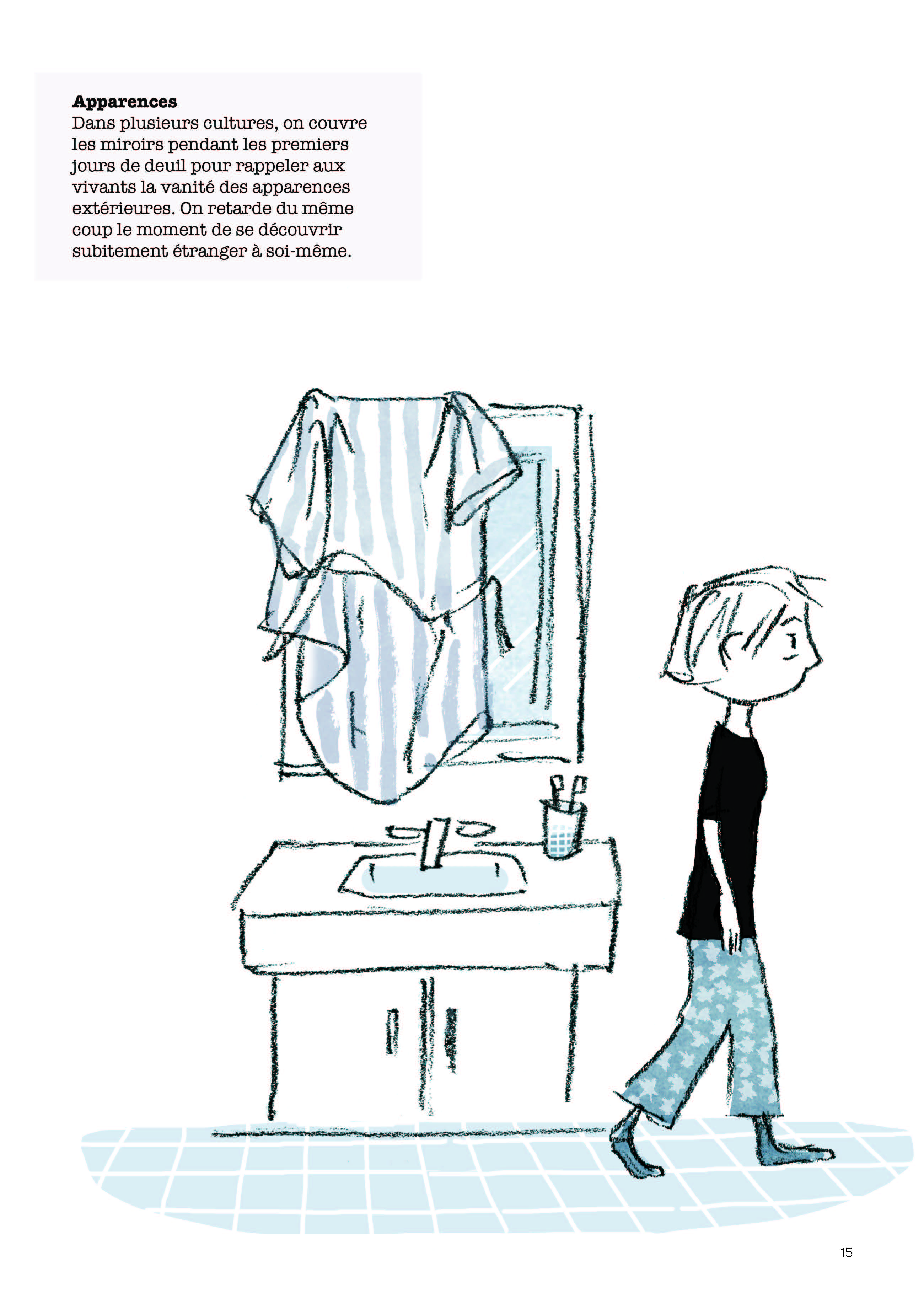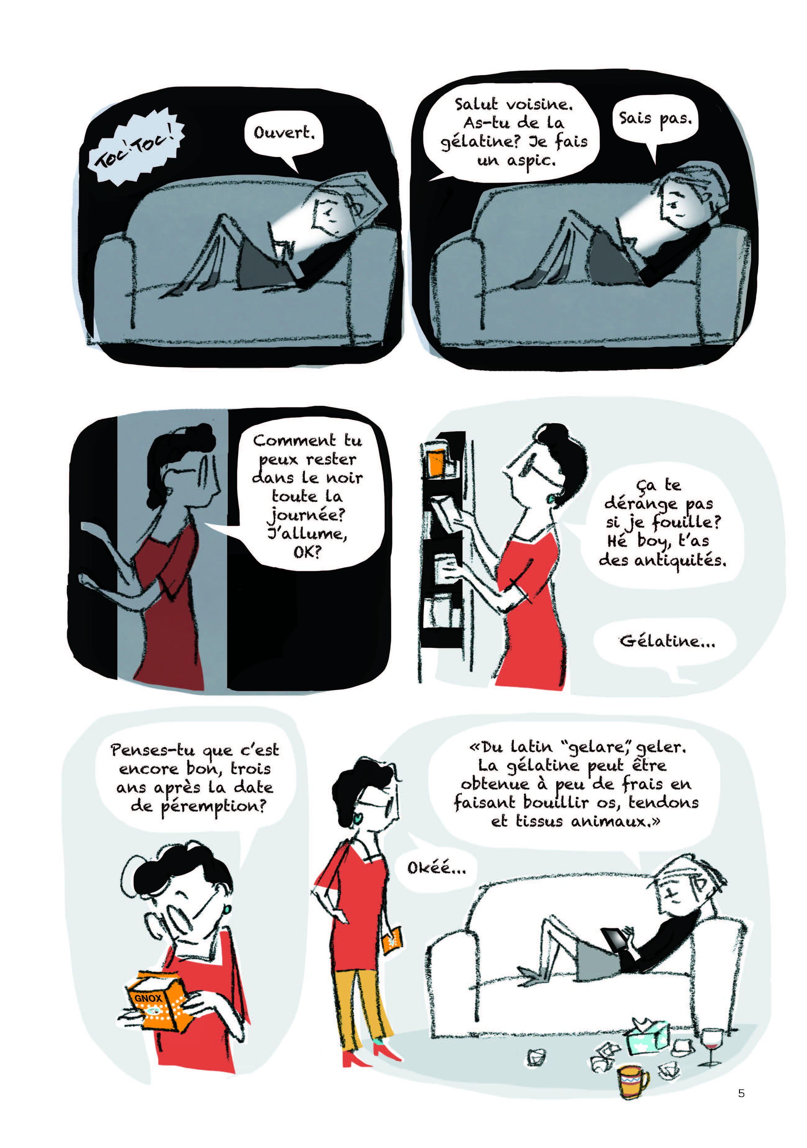 Terrée dans la lumière tamisée de son antre, une femme cuve son vin entouré de mouchoirs épars. Sa voisine bien qu’empathique à son malheur ce ne se laisse pas décontenancer par sa tristesse lors de ses visites impromptues. Au bout du compte, il est tout à fait normal qu’elle soit à ramasser à la petite cuillère au moment où elle vient de perdre son partenaire. Sa présence s’impose dans les moindres recoins de sa mémoire tandis que les déclencheurs se multiplient au fil de ses mornes journées. Il reste pourtant tant de choses à faire : l’enregistrement de l’acte de décès, le changement d’adresse postale, se départir de ses biens qui lui font du mal, recevoir des condoléances maladroites qui nous coulent comme sur le dos d’un canard… Le plus dur dans tout ça c’est que la Terre continue de tourner. Les factures s’accumulent et le capitalisme n’en a que faire de ses états d’âme. Son travail d’illustratrice doit se remettre en branle. L’abécédaire sur lequel elle planche devra irradier la joie de vivre. Il lui faudra aussi empoigner son courage à deux mains et sourire à belles dents pendant les ateliers scolaires question de ne pas effrayer les bambins avec sa mauvaise mine.